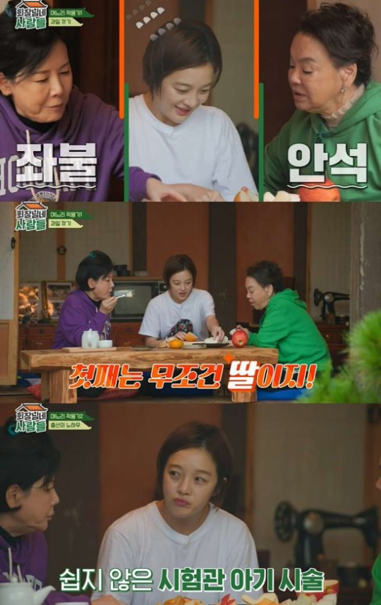 김수미는 과일을 깎는 황보라에게 "옛날 시어머니 같으면 너 결혼 퇴짜다. '다시 생각해 보자고' 한다"라며 껍질을 얇게 깎아라고 조언했다.