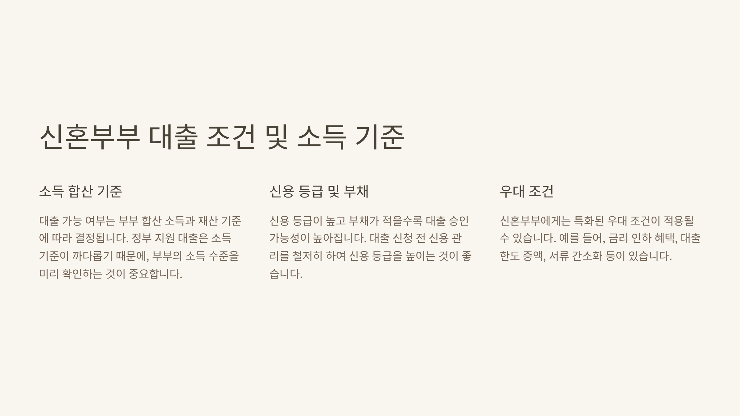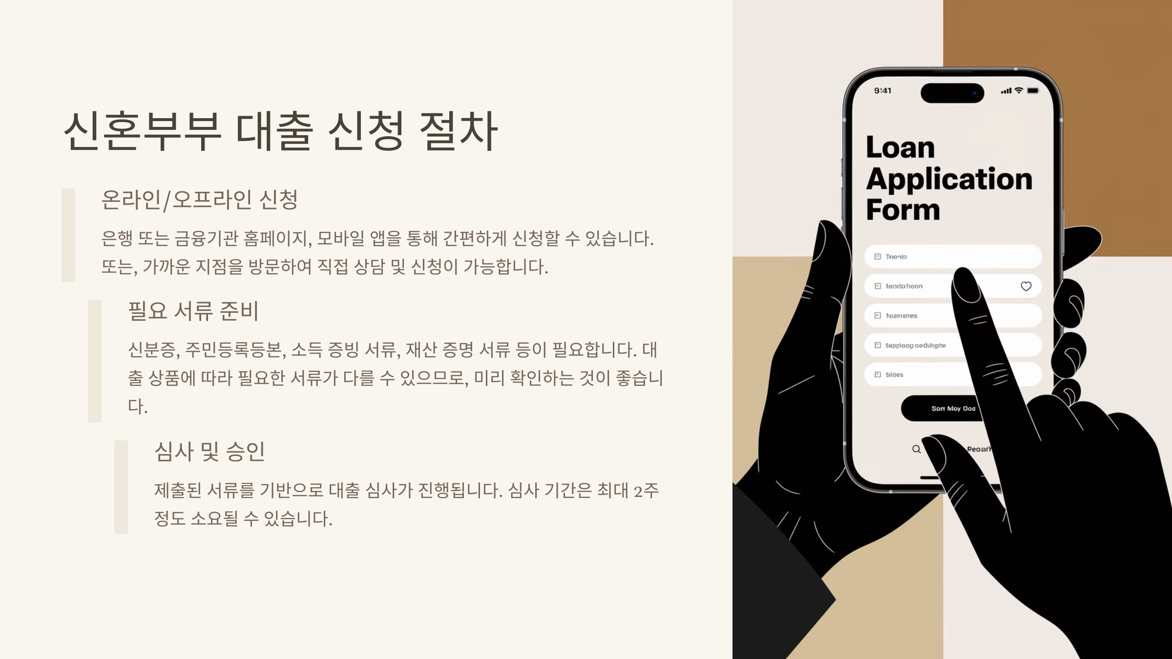 신혼부부 대출은 부부 합산 소득, 신용 점수, 기존 부채 등에 따라 승인 여부가 결정됩니다.