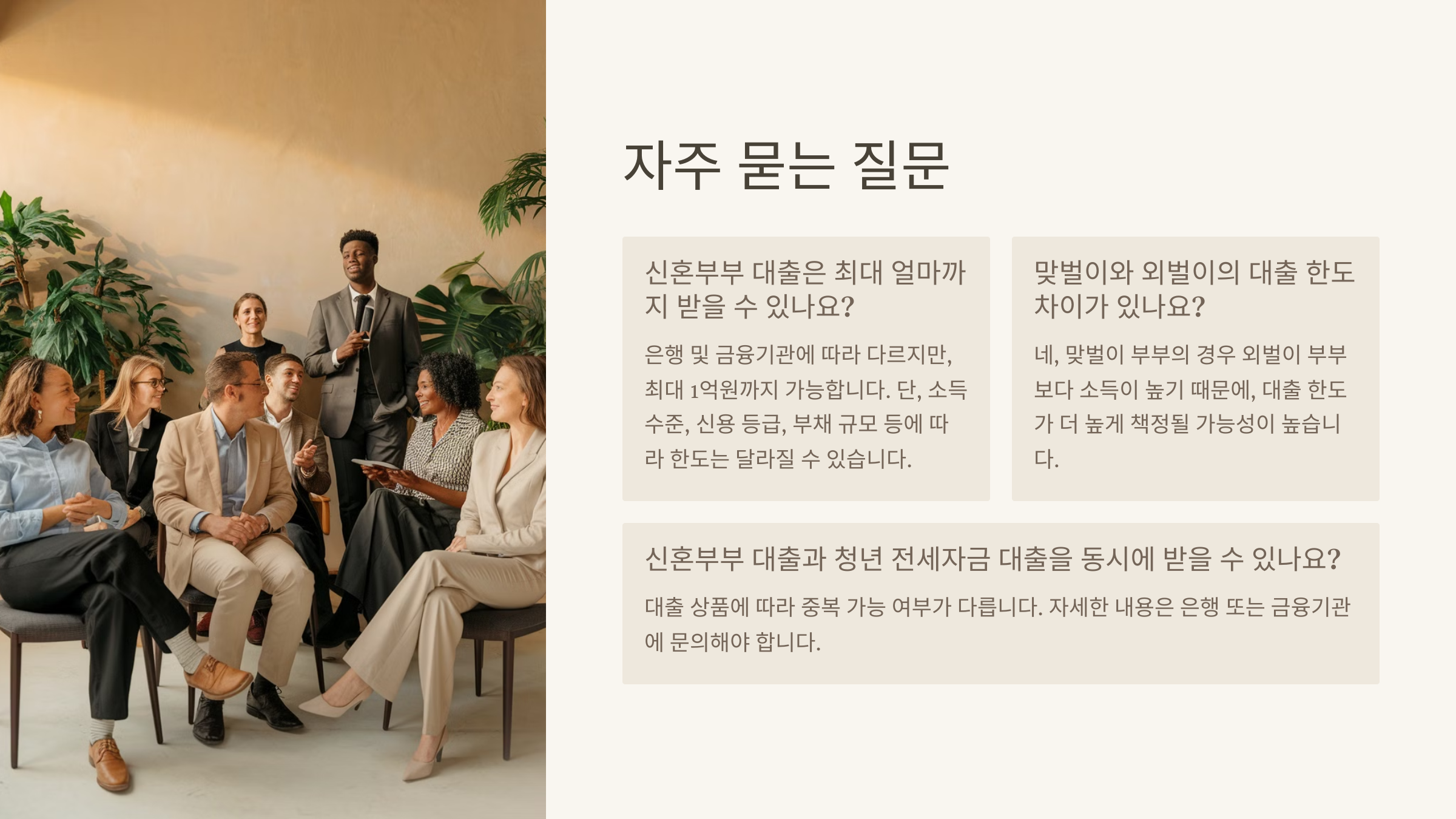 A: 대출 한도는 부부 소득, 주택 가격, 대출 상품에 따라 달라지므로 은행 상담을 통해 확인하는 것이 좋습니다.
