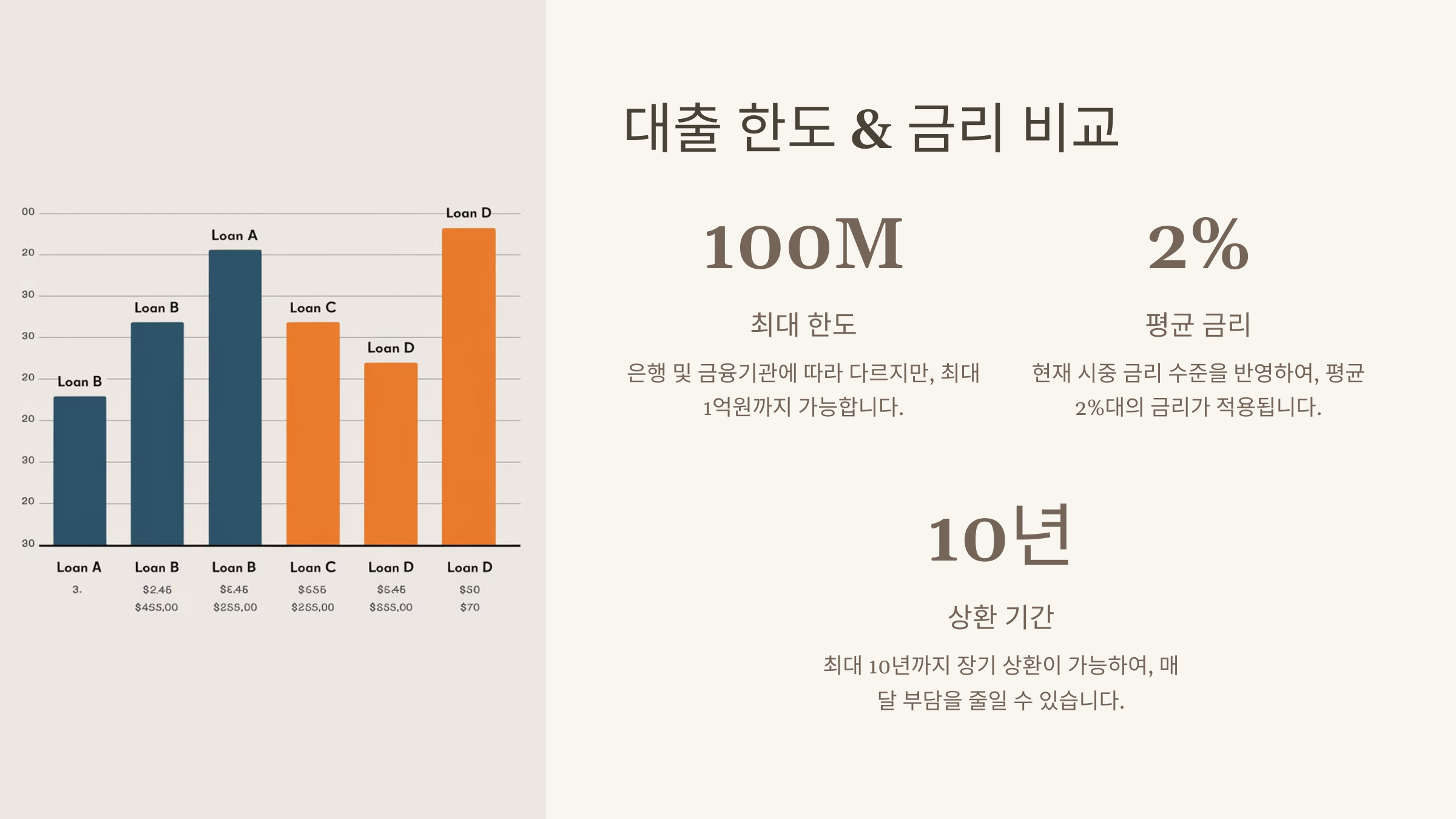 대출 한도와 금리는 소득 수준, 주택 가격 등에 따라 차이가 발생할 수 있습니다.